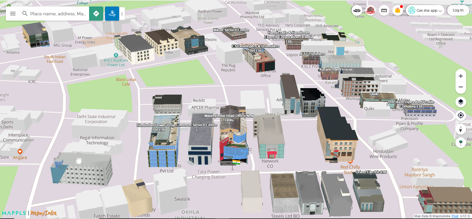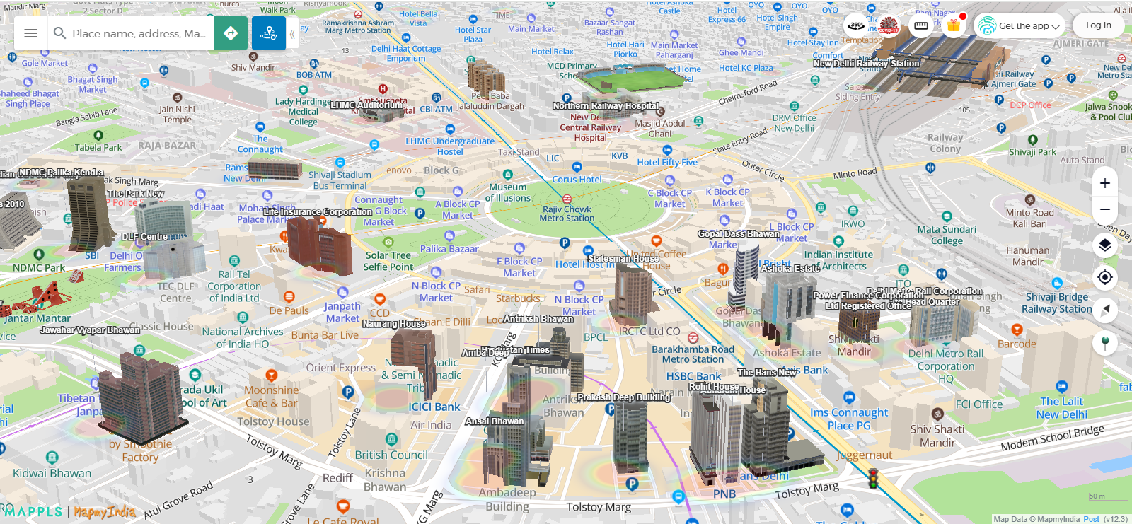 The Mappls Map feature known as "3D landmarks" enhances the visibility of specific landmark structures by displaying them as overlays on the map. These structures are presented with textures and offer additional details in their three-dimensional (3D) geometry, as depicted in the provided screenshot.